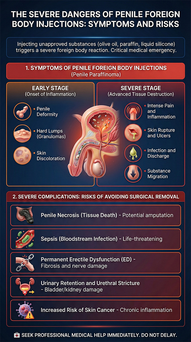 Injecting unapproved foreign substances into the penis—such as olive oil, paraffin, or liquid silicone—is a critical medical emergency and a highly prevalent issue in reconstructive urology. The human body cannot absorb or break down these materials, which inevitably triggers a severe and destructive foreign body reaction.
