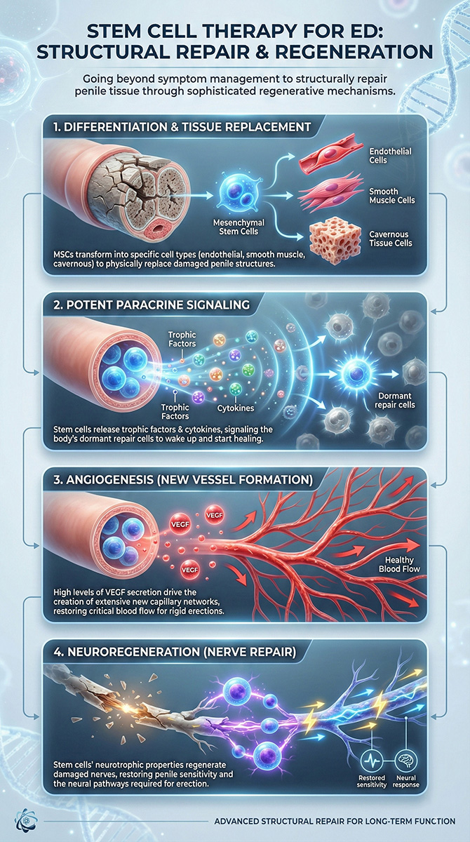 Stem Cell Therapy for Erectile Dysfunction is the pinnacle of regenerative medicine. It utilizes Mesenchymal Stem Cells (MSCs)—potent biological shapeshifters—obtained from your own body (autologous) or ethically sourced umbilical cord tissue. These cells have the unique ability to differentiate into various cell types, directly repairing damaged tissues, blood vessels, and nerves to reverse the root causes of ED.