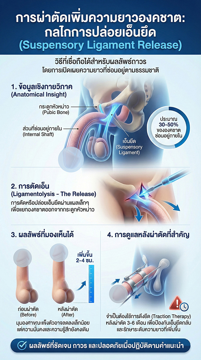 2. Ligamentolysis (The Release): Through a small, discreet incision (usually in the pubic area), the surgeon carefully cuts or 'releases' this ligament. This detaches the penis from the pubic bone, allowing the internal shaft to drop forward and extend outward.
